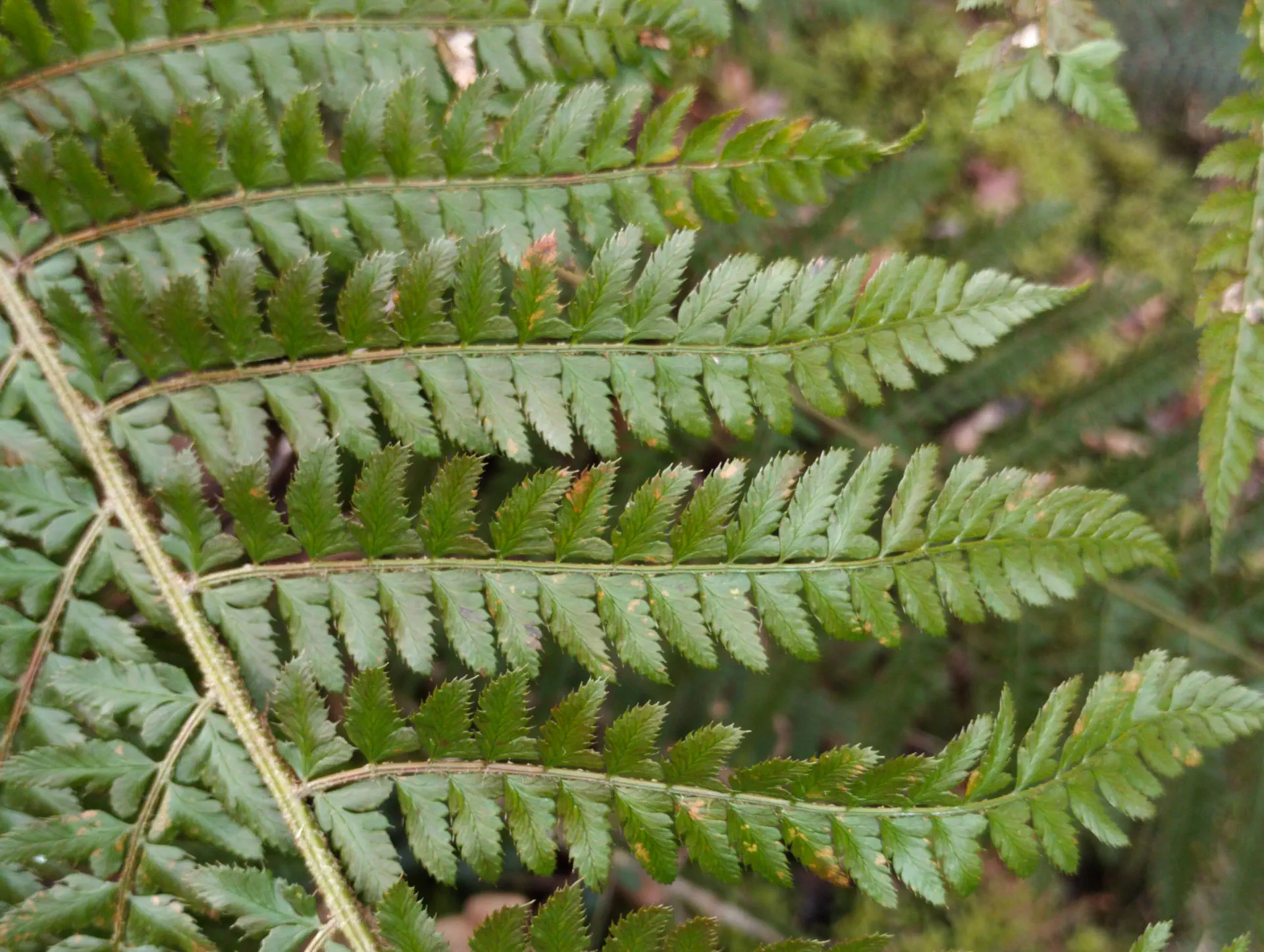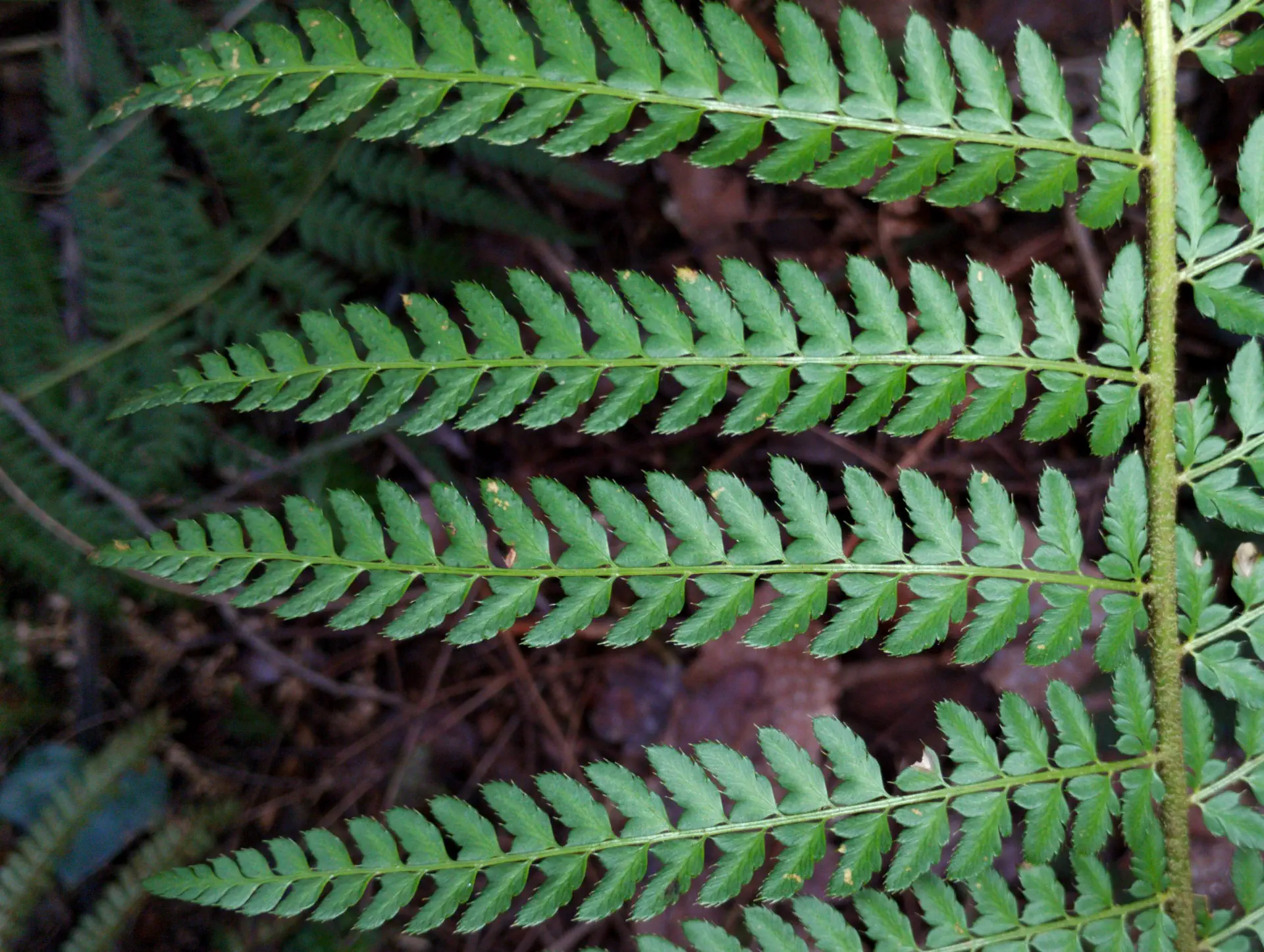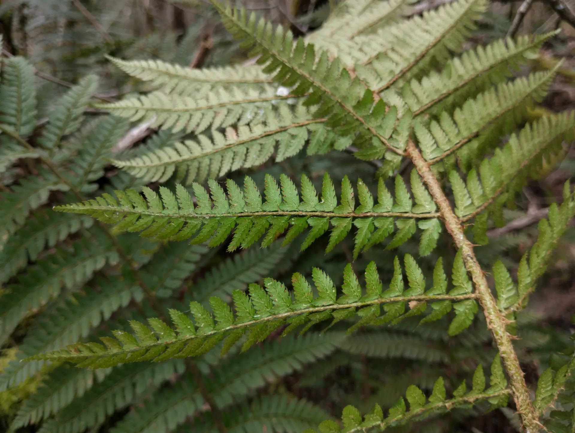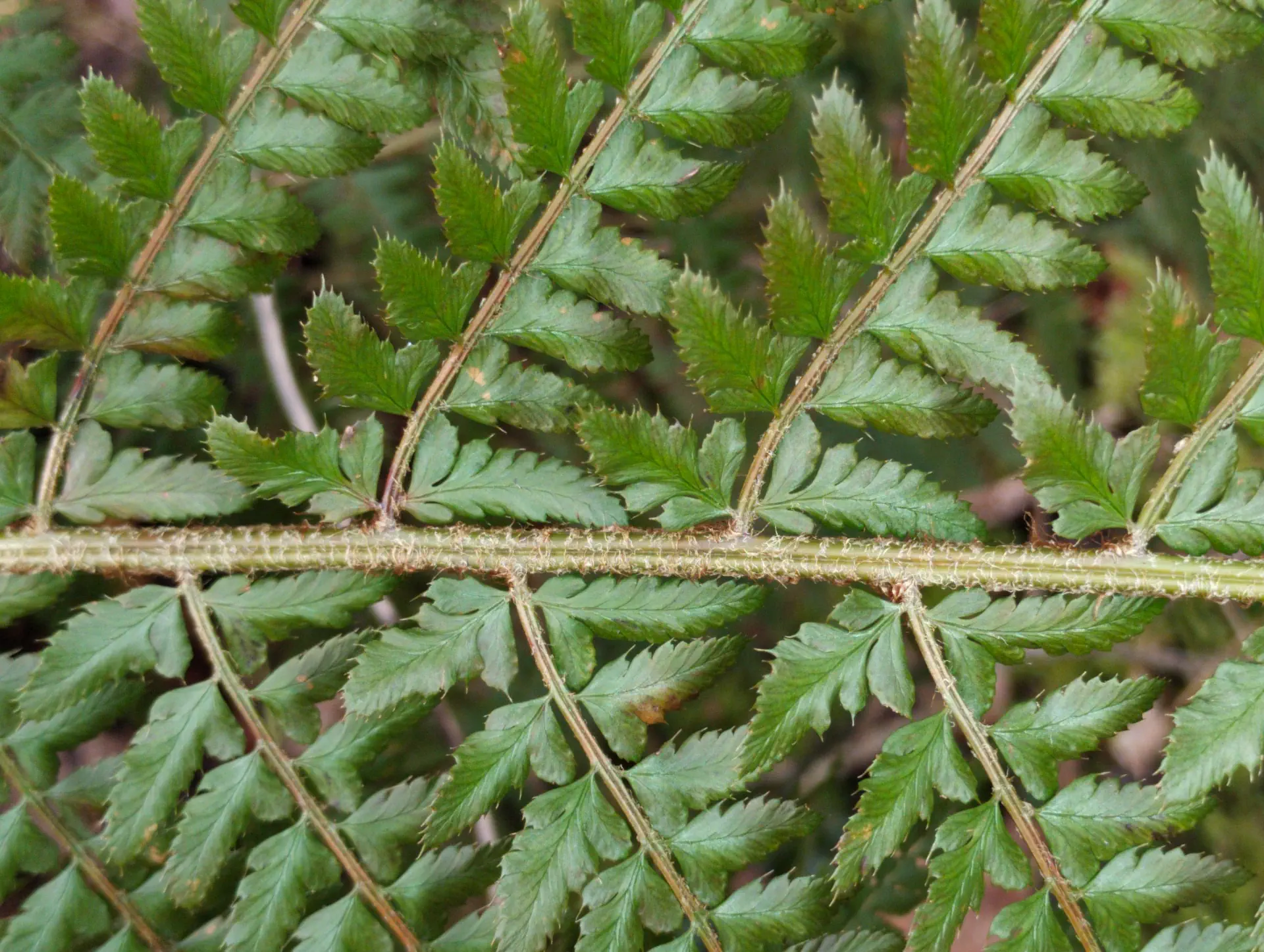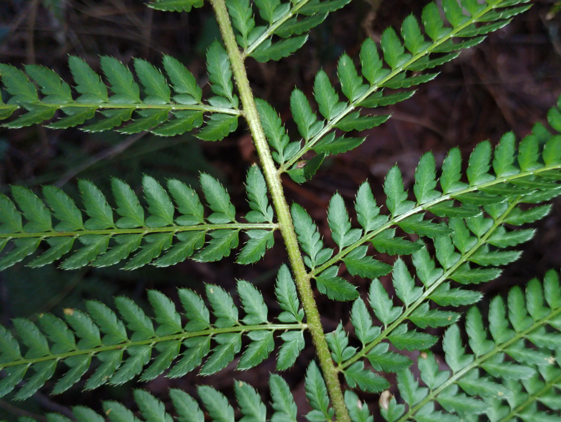 The two individuals below were found in a mixed population in the presence of both parent species nearby. They exhibit an intermediate morphology between P. setiferum - slightly reduced basal pinnae, petiolules and auricles at the base of every pinnule - and P. aculeatum - with pinnules having an acute angle of attachment on the rachilla, the first pinnule of each pinna being longer than the others.
